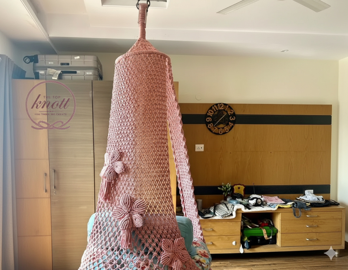 The natural wooden flooring and modern room setting in the background further highlight how seamlessly this swing blends tradition with contemporary design. The Blush Pink Macramé Swing Chair is more than just seating — it’s an expression of comfort, creativity, and modern boho living.