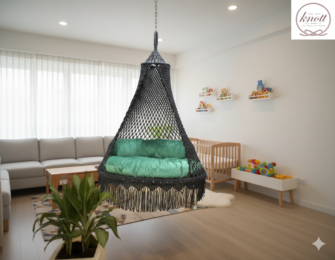 Add a cozy boho touch to your living room or nursery with The Top Knott’s Black Macramé Hanging Chair. Handcrafted with durable cotton rope and a plush mint cushion, it blends comfort, elegance, and modern design.
