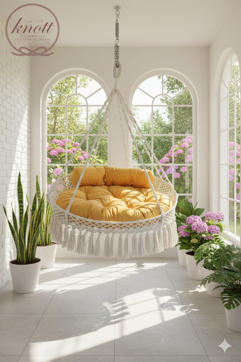 Handwoven rope swing with intricate knotwork and tassel detailing, paired with a plush mustard-yellow cushion for ultimate comfort. Perfect for bedrooms, balconies, or living spaces, this boho-style swing adds charm and relaxation to any home.