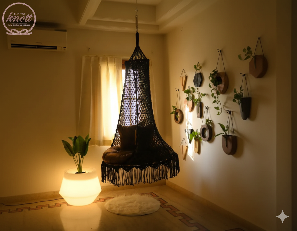 Handcrafted Black Macramé Hanging Chair – Boho Indoor Swing