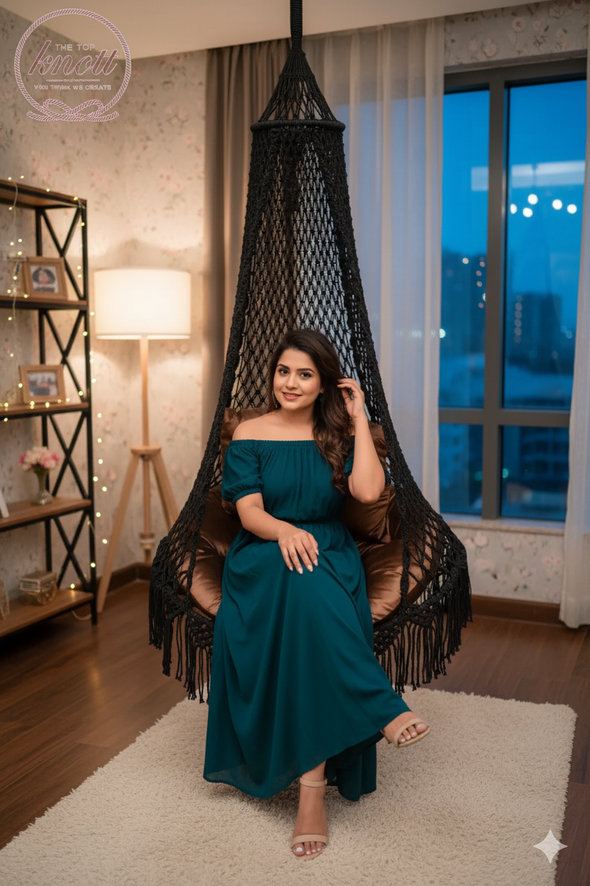 A stylish woman in a teal off-shoulder dress sits gracefully on a black macramé hanging chair in a modern, cozy indoor setting.