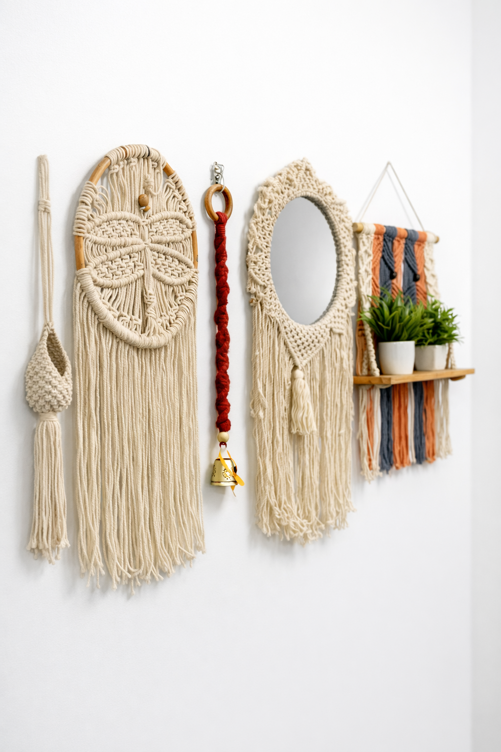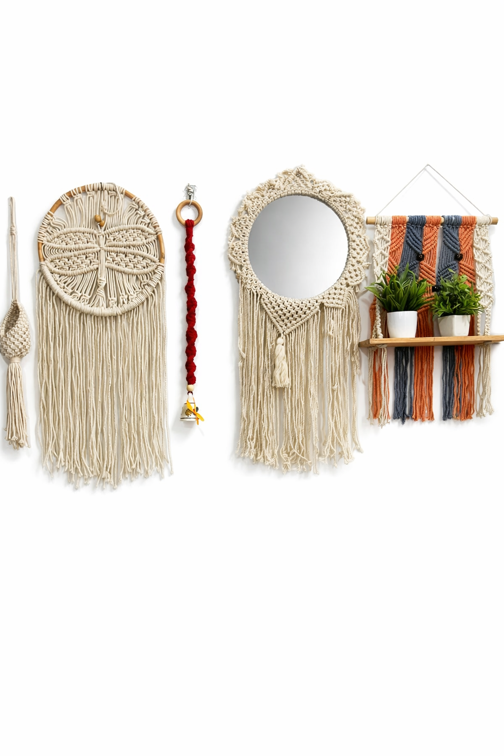 This curated set includes intricately woven wall hangings, a round macramé-framed mirror, a decorative hanging charm, and a functional macramé shelf for small plants or décor accents. Each piece is made using high-quality cotton cord and natural wooden elements, ensuring durability while maintaining an organic, minimalist aesthetic.