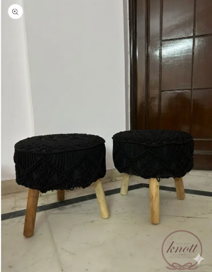 Enhance your living space with this beautifully handcrafted macramé ottoman stool, designed to bring style, comfort, and practicality to any room. Each piece is carefully woven using high-quality cotton rope, creating a unique textured look that instantly elevates your décor. Supported by solid natural wooden legs, the stool is durable, stable, and built to last.