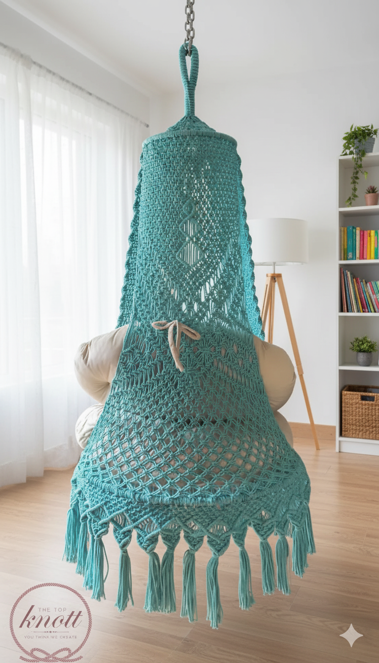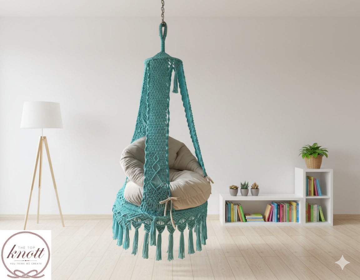 Made with premium cotton rope in a soothing turquoise shade, the swing is strong, durable, and eco-friendly. The detailed macrame design gives it a boho-chic charm, making it not just a piece of furniture but also a statement décor element. The swing comes with a plush, soft cushion that ensures hours of cozy lounging, reading, or simply unwinding.