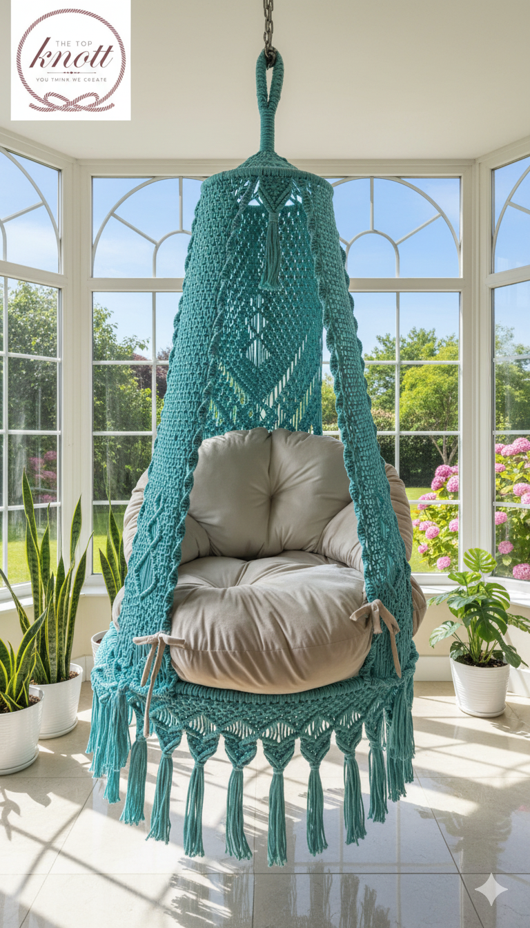 Shop The Top Knott’s premium macrame swing chair, handwoven with cotton rope and paired with a soft cushion. Perfect for living rooms, balconies, or bedrooms – stylish, durable, and comfortable.