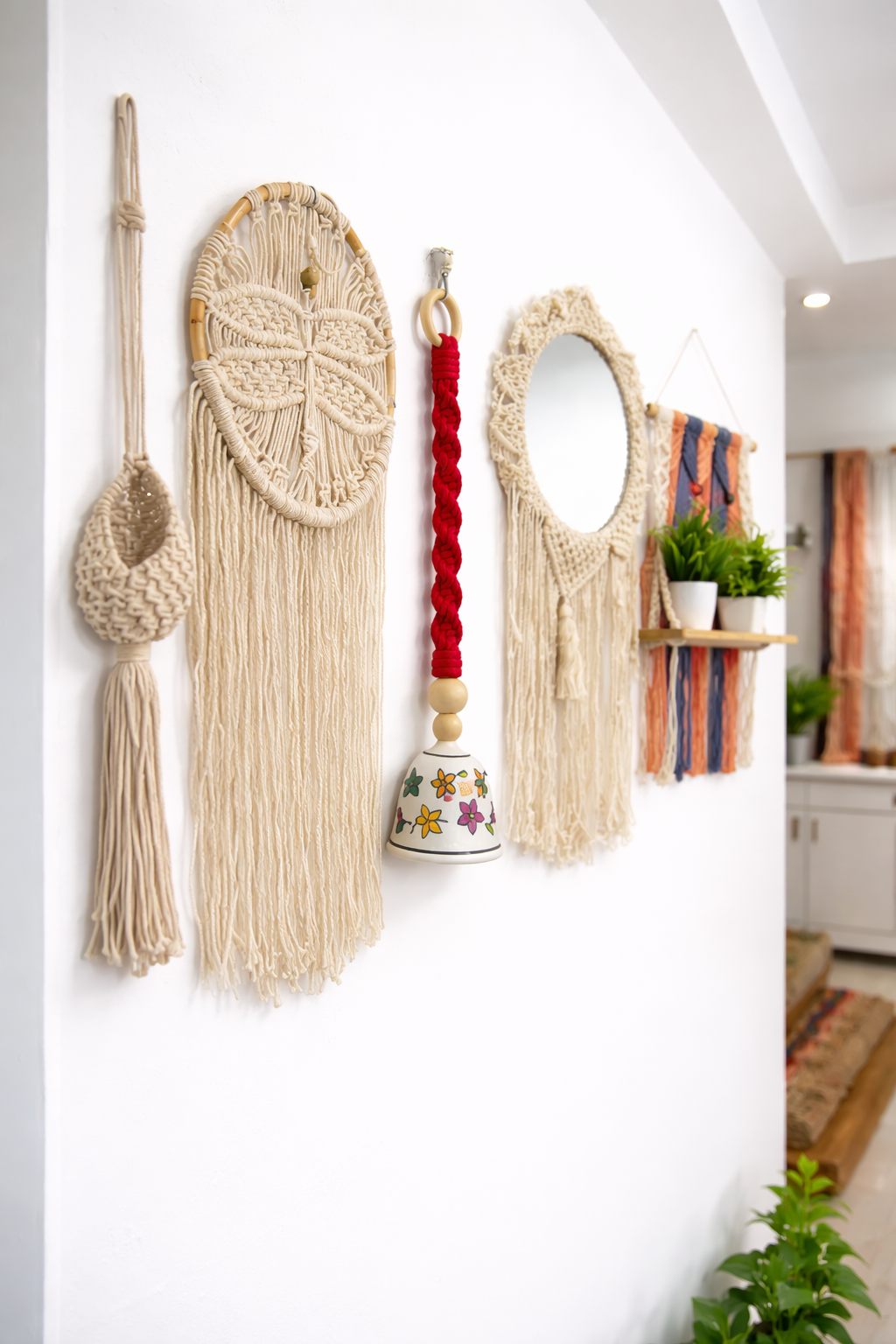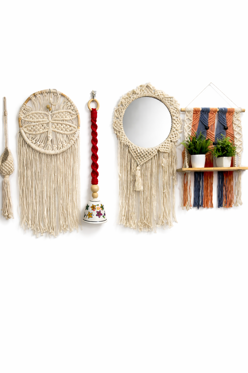 Enhance your space with this handcrafted macramé wall décor set featuring a round mirror, plant shelf hanger, woven wall art, and a hand-painted ceramic bell. Ideal for bohemian and modern interiors.