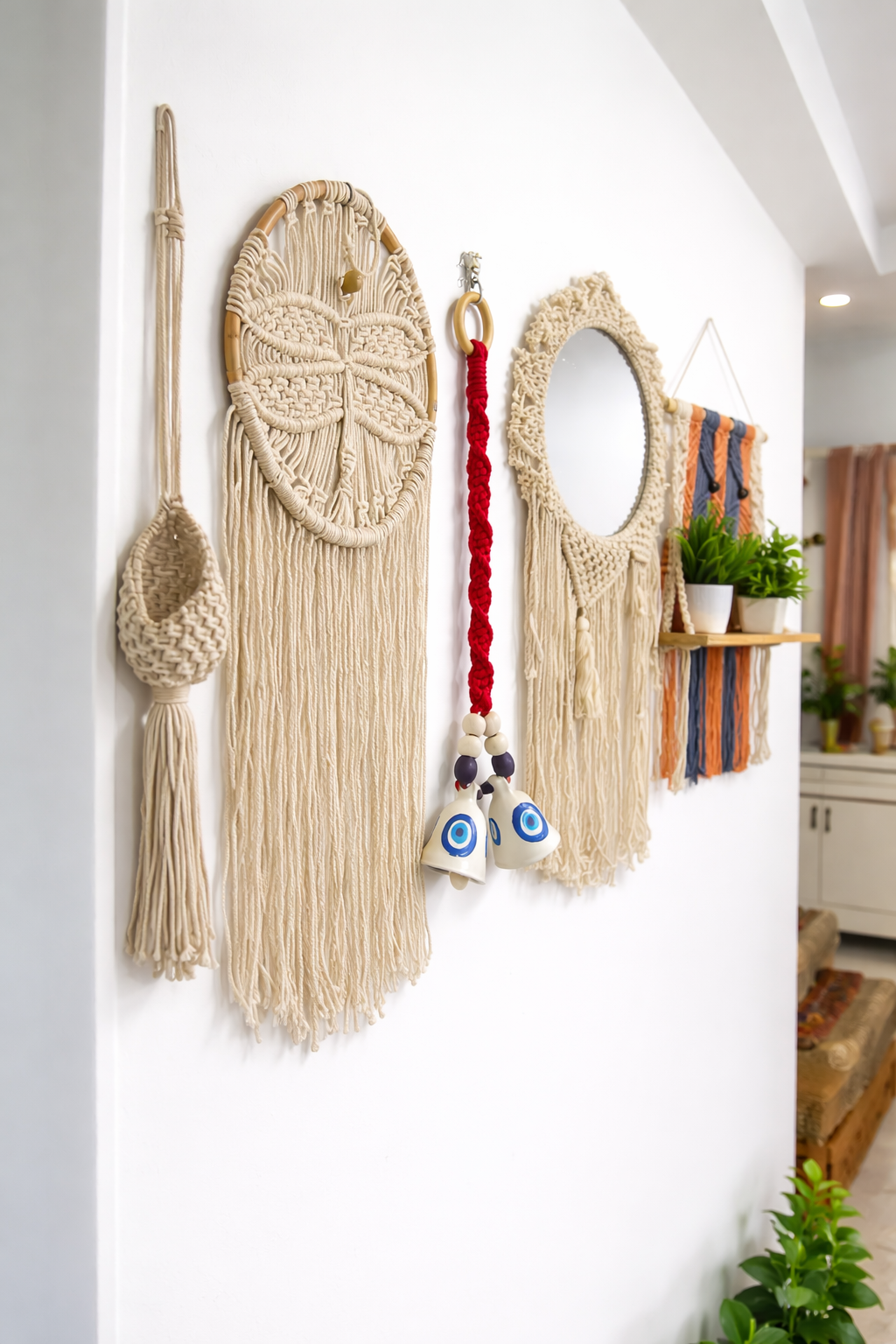 Elevate your interiors with this premium handcrafted macramé wall décor set featuring a decorative mirror, plant shelf hanger, woven wall art, and traditional evil eye charm. Perfect for bohemian, modern, and minimalist spaces.