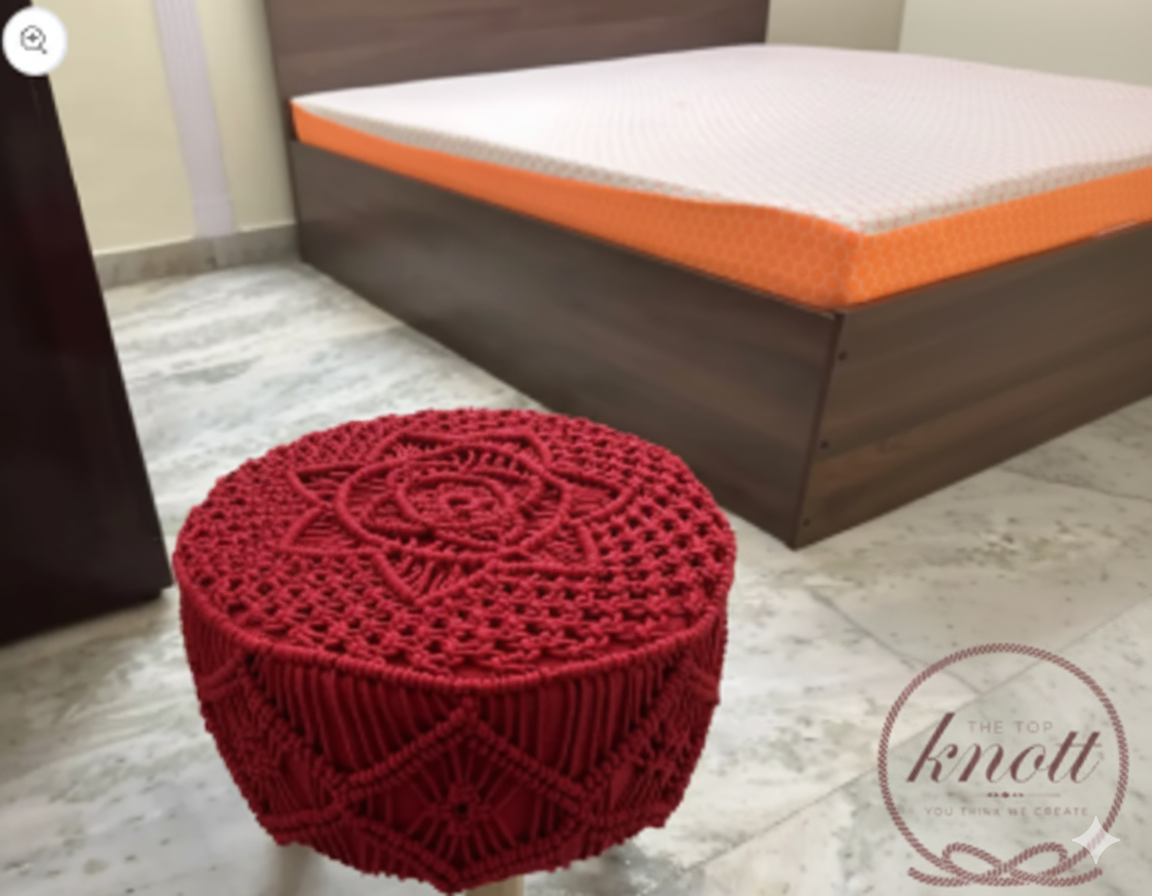 Make a bold style statement in your home with this beautifully handcrafted red macramé stool. The seat showcases an elaborate macramé design with a mandala-inspired pattern, giving it a rich, artistic texture. The deep red color adds warmth, energy, and character to any interior space, making it an ideal choice for those who love expressive décor.