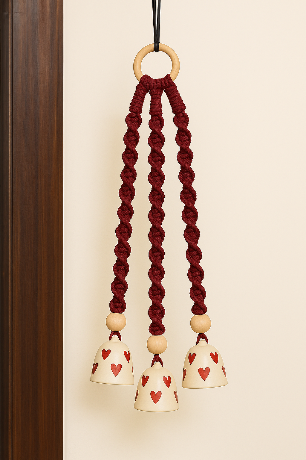 Whether used to beautify a doorway, uplift a wall, or simply bring a touch of love to your home, this red macramé triple bell hanging adds charm, positivity, and timeless craftsmanship to any corner.