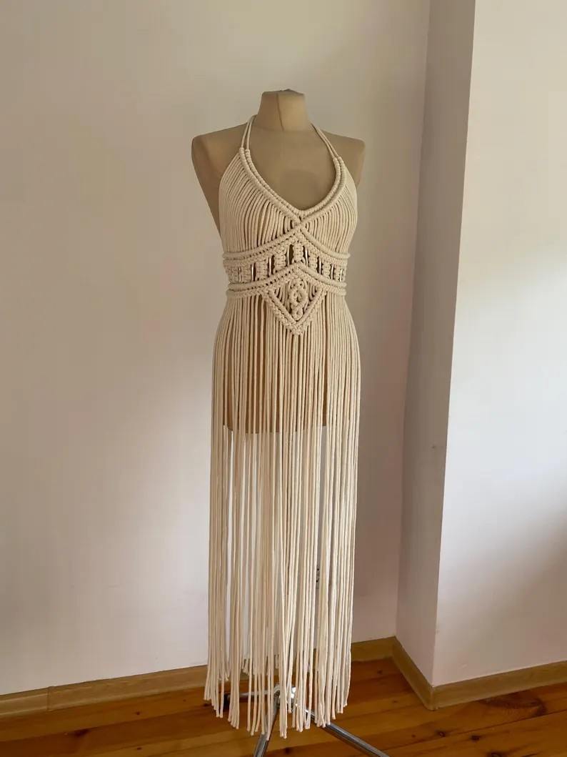 Each piece is carefully crafted by hand, ensuring a unique and beautifully detailed finish. Whether you want to transform a simple dress or add texture to a fashion-forward outfit, this macramé body harness delivers a bold yet natural aesthetic.