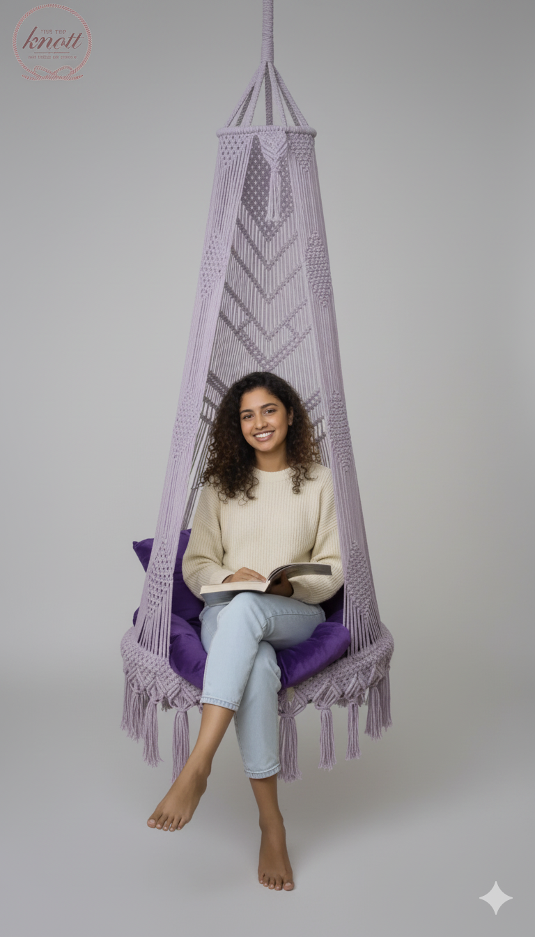 Transform your garden into a serene escape with the Top Knott Lavender Macrame Hanging Chair — a beautiful expression of art, comfort, and tranquility. Handcrafted by skilled artisans, this hanging swing features intricate macrame patterns and soft cotton ropes, dyed in a soothing lavender hue that perfectly complements natural outdoor settings.