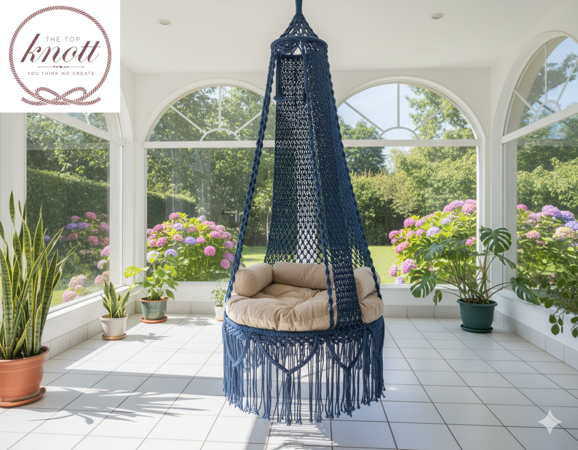 ransform your living space into a cozy retreat with this beautifully handcrafted macrame hanging swing chair. Made with strong, durable cotton ropes and detailed with intricate knotting, this swing is a perfect blend of strength, comfort, and elegance. The boho-inspired design, combined with its soft beige round cushion and side pillows, provides ultimate relaxation while enhancing the aesthetics of your room.