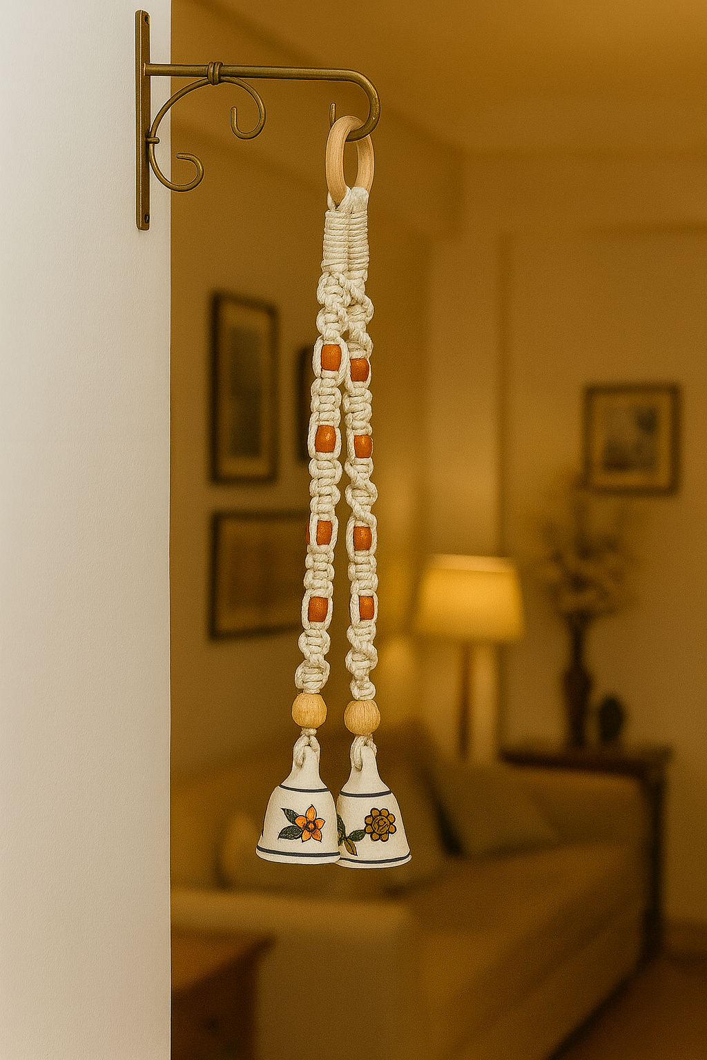 The piece is finished with two handcrafted ceramic bells, each adorned with delicate hand-painted floral motifs. These bells not only add visual appeal but also carry a nostalgic, artisanal touch that blends beautifully with both contemporary and traditional décor.