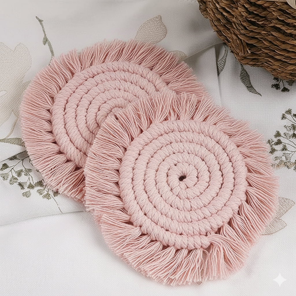 Pink Macrame Round Coasters – Set of 2 | Handmade Cotton Table Decor