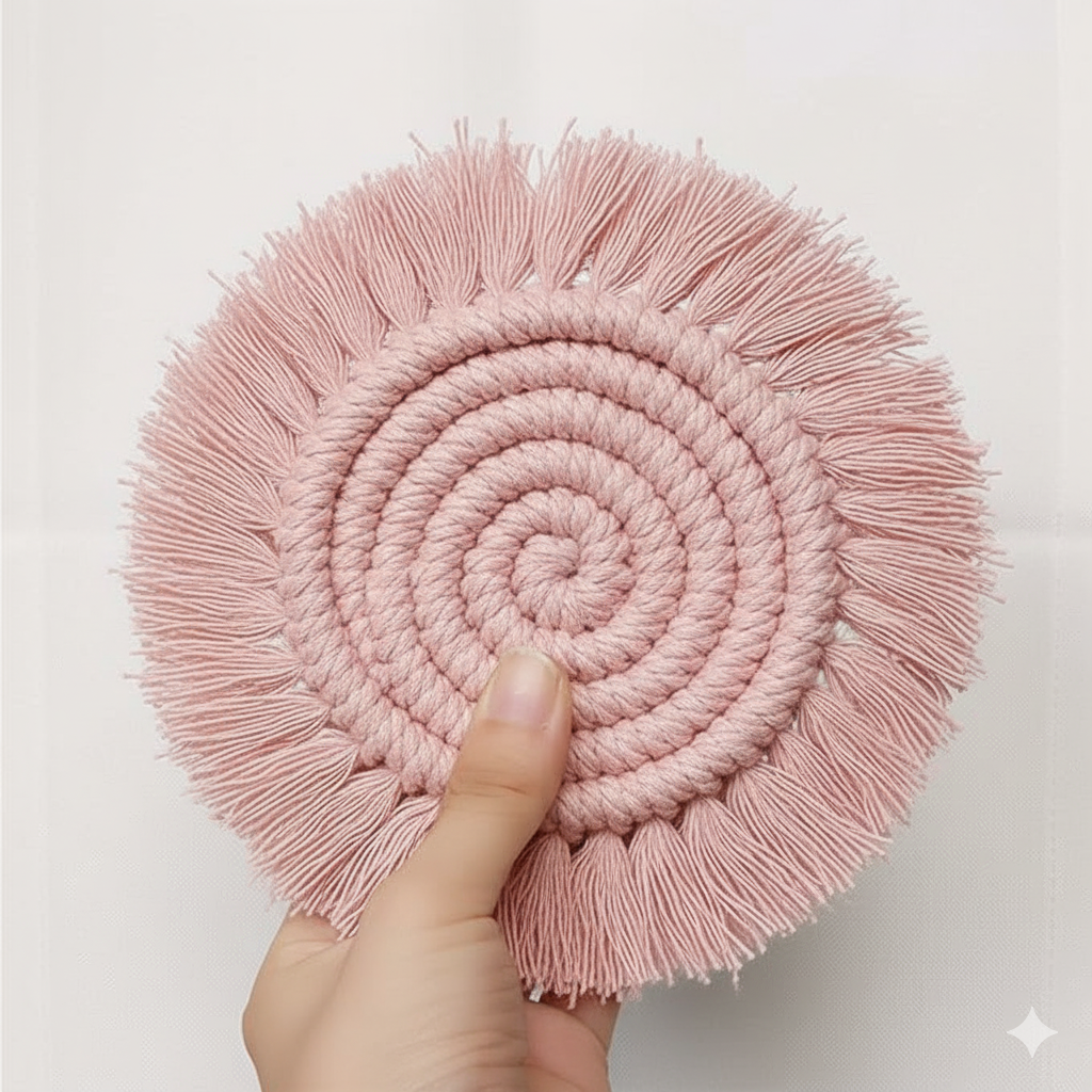 Add a pop of charm and elegance to your home with our Pink Macrame Round Coasters. Each coaster is lovingly handmade using premium-quality cotton rope, designed in a spiral pattern with delicate fringes for that perfect boho look. The soft pink hue complements a variety of interior styles — from minimalist to romantic or modern chic.