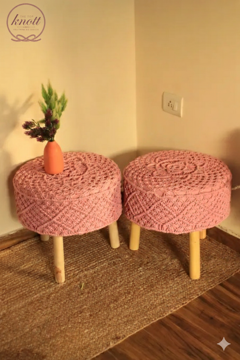 Infuse a touch of elegance and handmade beauty into your home with the Pink Macrame Stool by The Top Knott. This artisanal piece features a beautifully woven macrame design in soft pink tones, perfectly balanced with sturdy wooden legs for durability and charm.
