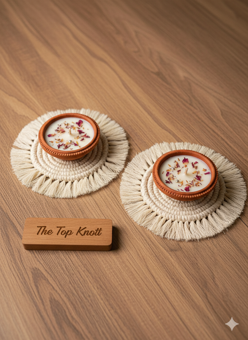 Handcrafted festive combo with 2 macrame tea coasters and 2 soy wax diya candles. Eco-friendly, elegant, and perfect for Diwali décor or gifting.