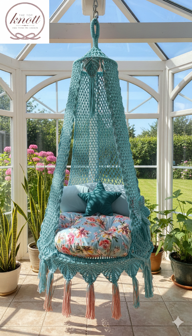 Relax in style with The Top Knott’s Teal Sapphire Swing – a 35″ handcrafted macrame hanging chair with aqua cushions and a star pillow. Perfect for adding comfort and boho charm to any room or balcony.
