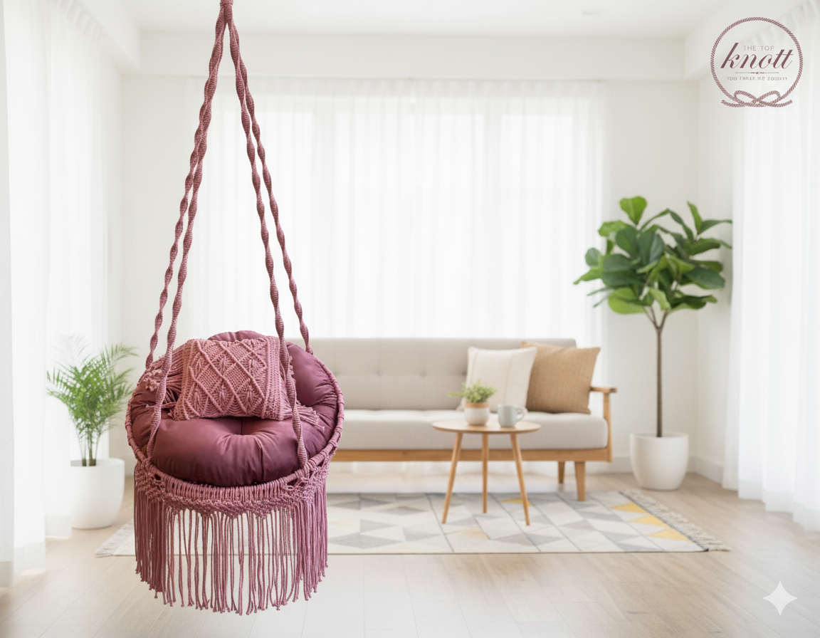 Elevate your indoor or balcony space with The Top Knott Blush Harmony Macramé Swing Chair — a handcrafted, pastel-toned hanging chair that blends comfort, craftsmanship, and bohemian elegance.