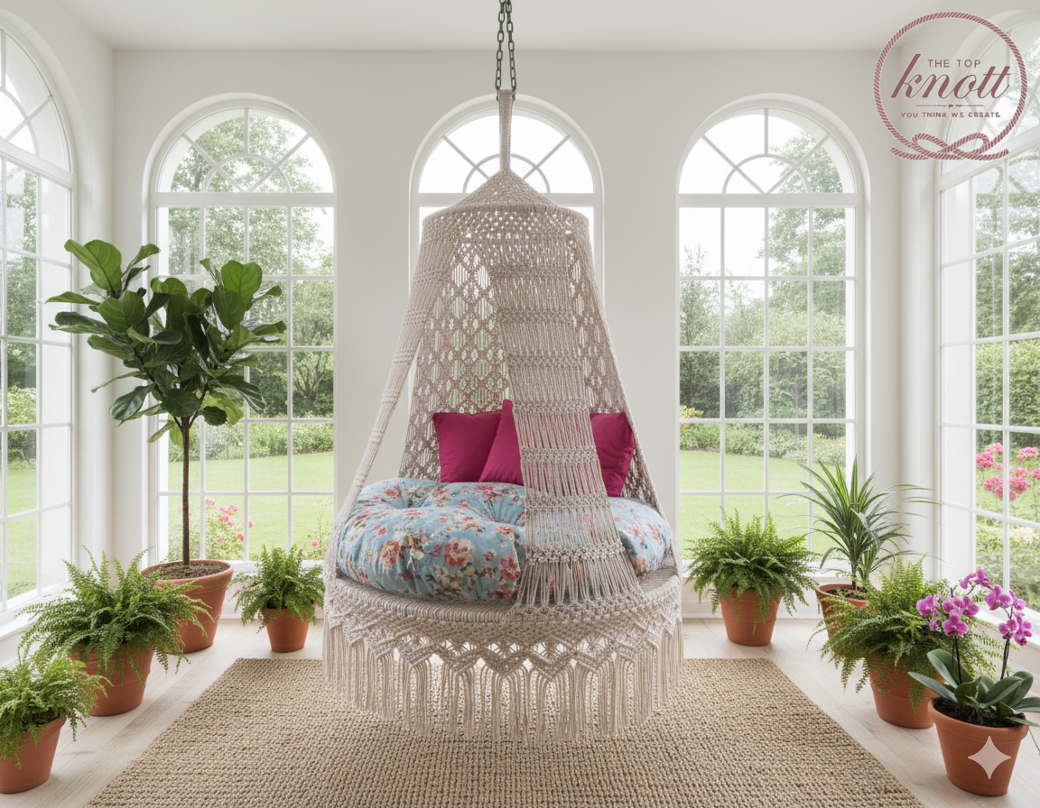 Transform your living space into a serene boho sanctuary with The Top Knott’s exquisitely handcrafted Macramé Canopy Swing Chair. Designed to offer the perfect blend of comfort, elegance, and artisanal craftsmanship, this swing is meticulously woven using premium cotton rope, creating a breathable, sturdy, and visually stunning pattern.
